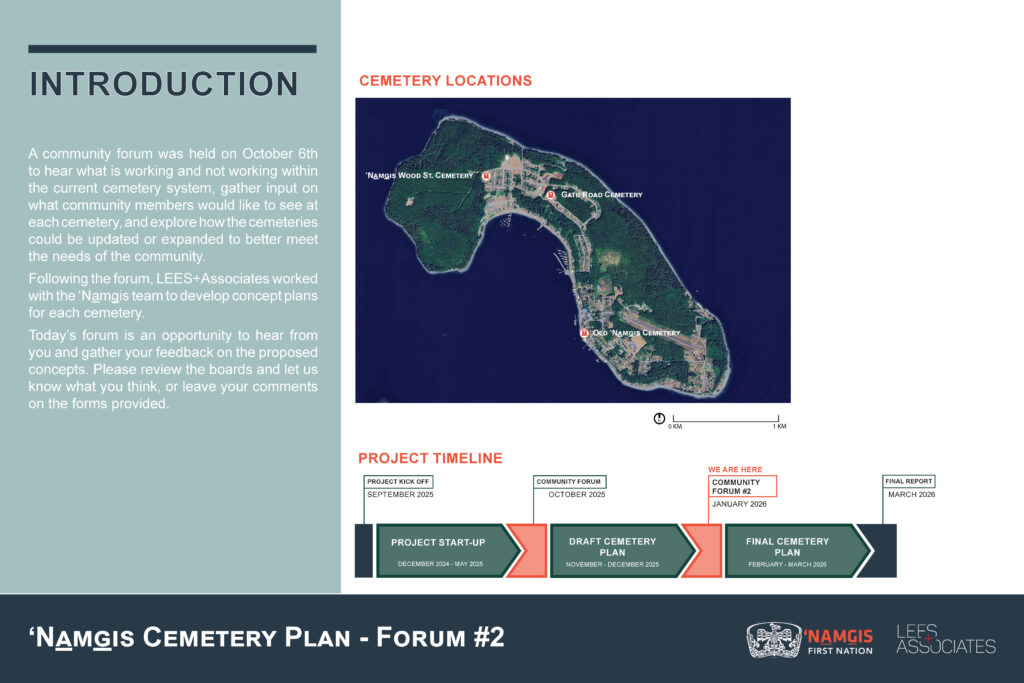 In January 2026, ‘Na̱mg̱is First Nation hosted Community Forum #2 as part of the Cemetery Planning Project. During this forum, draft concept plans were presented for each cemetery to show possible layouts, access improvements, and future interment options.